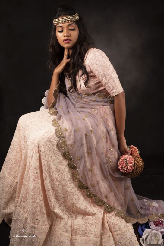 This elegant baby pink chickenkari lehenga set combines delicate embroidery with a modern silhouette, creating a perfect blend of tradition and style. The lehenga features intricate floral patterns, while the grey scallop-edged dupatta adds a sophisticated contrast. Ideal for festive occasions or weddings, this ensemble exudes grace and timeless beauty