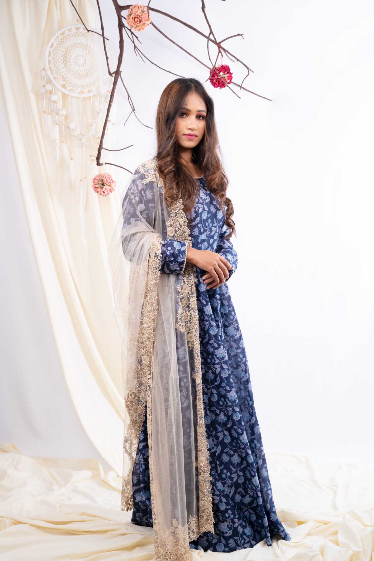 The Indigo Chanderi Floral Kurta, made from premium Chanderi silk, features delicate threadwork and shimmering sequins that enhance its timeless beauty. Paired with an off-white net dupatta, this set radiates grace and sophistication.