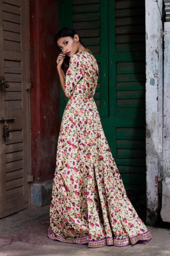 The Off-White Silk Floral Printed Long Dress exudes elegance with its soft silk fabric and delicate floral prints. Intricate sequins embroidery adds a touch of sparkle, elevating the overall design. A timeless piece perfect for evening soirées or festive celebrations.