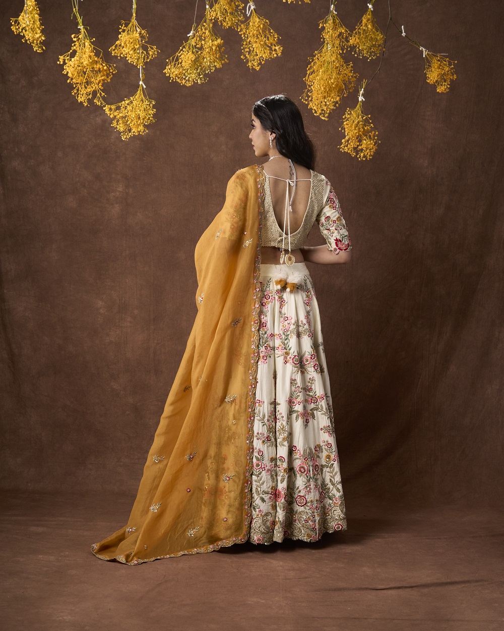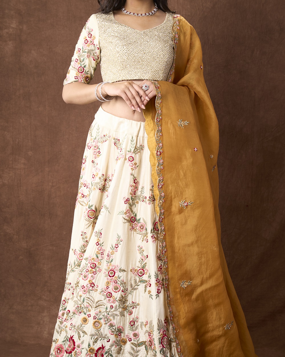 Offwhite Floral Embroidered Lehenga With Mustard Organza Dupatta Set