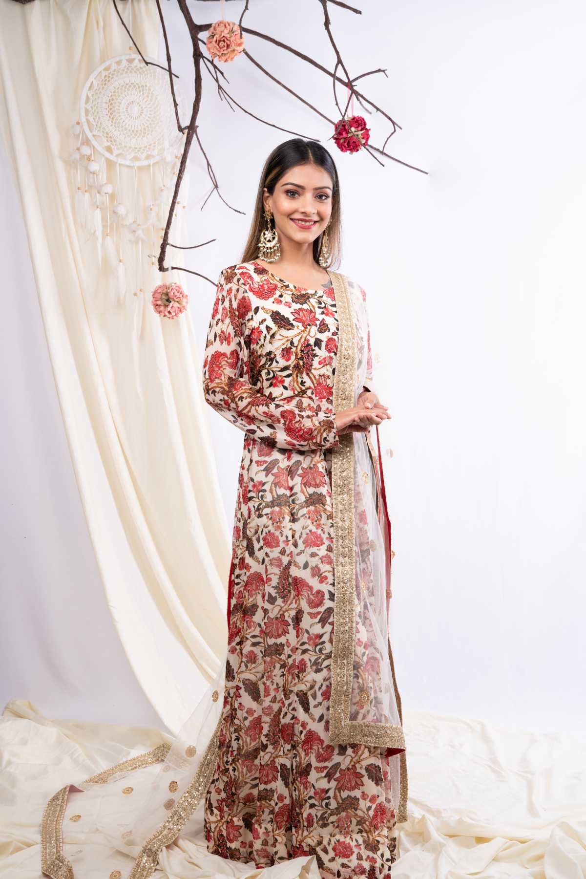 The Off-White Floral Printed Ghera Kurta Set, crafted from lightweight georgette, features a soft, flowing silhouette that adds effortless grace. The floral print is beautifully complemented by delicate sequins work, while the net dupatta enhances the ensemble with a subtle touch of glamour.