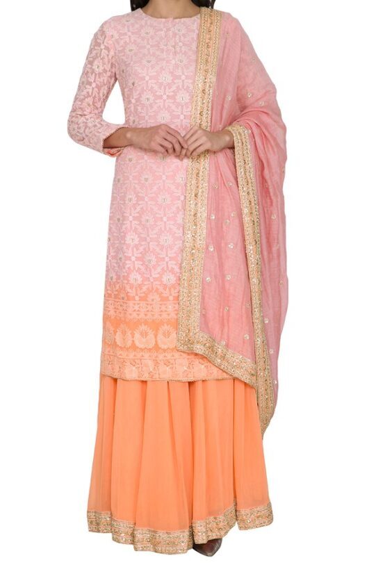 The Old Rose Pink to Peach Shaded Chikankari Sharara Set blends rich Chanderi silk and georgette for a soft, luxurious feel. The delicate cutdana and sequins embroidery adds a touch of sparkle to the intricate chikankari work, creating a stunning, gradient effect.