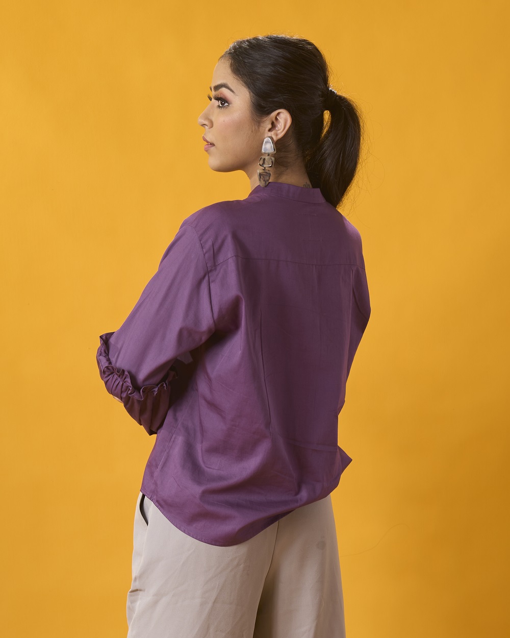 Sophisticated with a touch of drama, this Purple Gathered Sleeve Shirt features voluminous sleeves that add elegance and movement. The rich purple hue enhances its regal appeal, making it a standout piece.