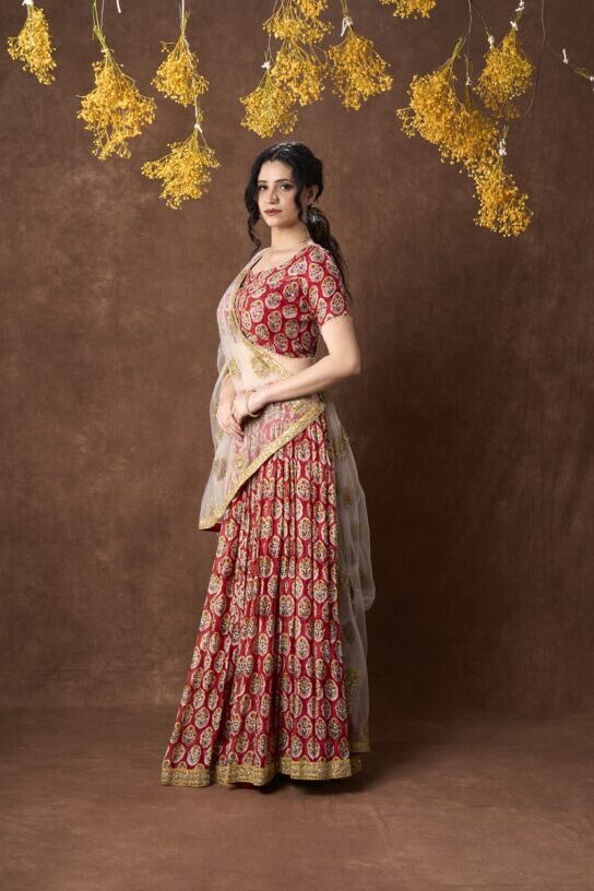 The Red Printed Chanderi Lehenga Set features a vibrant print on luxurious Chanderi fabric, offering a beautiful balance of tradition and modernity. The lehenga’s graceful flow and matching blouse create an effortlessly elegant look, ideal for festive events or special celebrations.