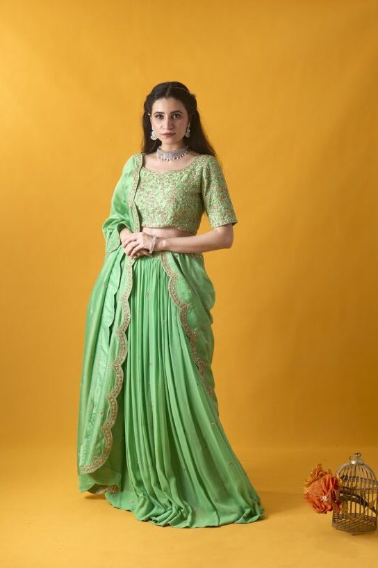 The Sea Green Chanderi Lehenga Set exudes a serene elegance, crafted from luxurious Chanderi fabric that drapes beautifully. The scallop-embroidered dupatta adds intricate detail and a touch of sophistication, elevating the entire ensemble.